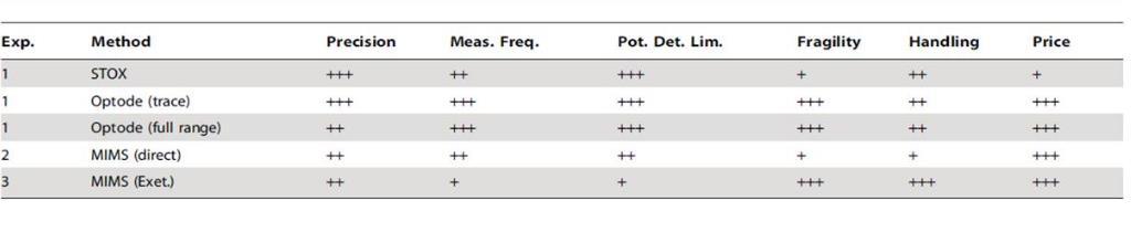 表2、不同測試方法在精度、檢出限和適用性方面進行比較圖。表中的評級方案采用符號表示:正常(+)、強(++)和非常強(+++)。同時比較了傳感器的易損性、現場操作性和易損件的價格對比情況。
