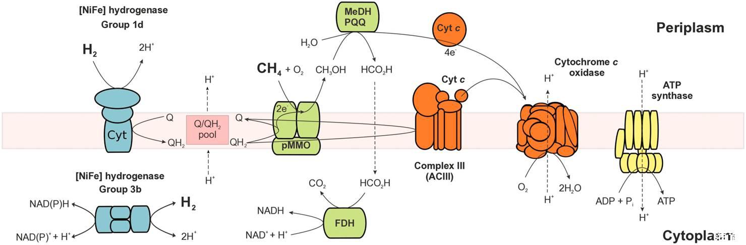 圖5、嗜酸的甲烷氧化菌株(sp.RTK17.1)的甲烷和氫氣的氧化模型示意圖。從圖中可以看出該菌在進行混合營養生長時,氫氣和甲烷的氧化都生產出同等當量的還原產物對苯二酚(QH2),其中的大量的氫質子轉移動力是基于氫質子改變為F1F0-ATP和酶產生的的足夠量的ATP能量。對苯二酚則是通過氫氣氧化提供的電子用于甲烷單甲氧化酶的催化產生的。NADH的還原則是基于甲酸脫氫酶以及氫氣依賴官能團[NiFe]-氫化酶的作用通過卡爾文循環去固定二氧化碳實現的。