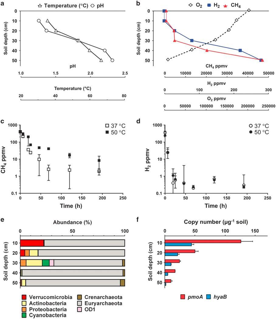 圖1、新西蘭地熱田中甲烷、氫氣氧化的地球化學、生化和分子特征。圖a)表示的是不同溫度下,不同深度土壤的溫度和pHf分布情況。圖b表示的是土壤不同深度處甲烷、氫氣和氧氣混合比例。圖c表示的是不同溫度下,土壤表面甲烷氧化過程隨時間的變化過程。圖d表示的是不同溫度下,土壤表面氫氣氧化隨時間變化的過程。圖e表示的是不同土壤深度下甲烷氧化菌的種群結構分布情況。圖f表示的是不同深度下土壤中疣微菌門甲氧化菌的基因編碼分布情況,具體指的是中疣微菌門甲氧化菌中有氧吸收氫化酶和顆粒狀甲烷單加氧酶的分布情況。