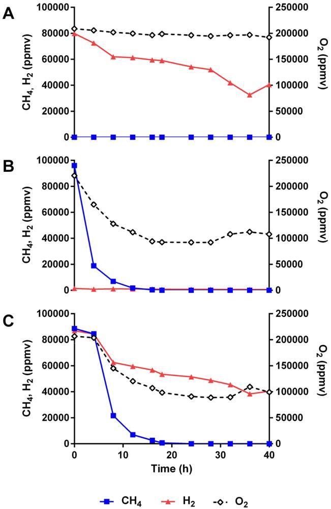 圖4、嗜酸的甲烷氧化菌株(sp.RTK17.1)對于甲烷和氫氣的既定氧化。其中細胞是使用靜態間歇式生物反應器在50攝氏度下反應培養的,其中固定相培養環境頂部空間使用的是氮氣中充入不同濃度的二氧化碳、氫氣、甲烷等氣體。其中圖a表示的是氮氣中充入了19%CO2,20%O2,、9%H2,體系中的甲烷、氫氣、氧氣的隨時間的變化情況。。圖b表示氮氣中充入9%H2、9%CH4體系中的甲烷、氫氣、氧氣的隨時間的變化情況。圖c表示的是甲烷存在或氫氣存在的條件下,加入10%的氮氣后,體系中的甲烷、氫氣、氧氣的隨時間的變化情況。