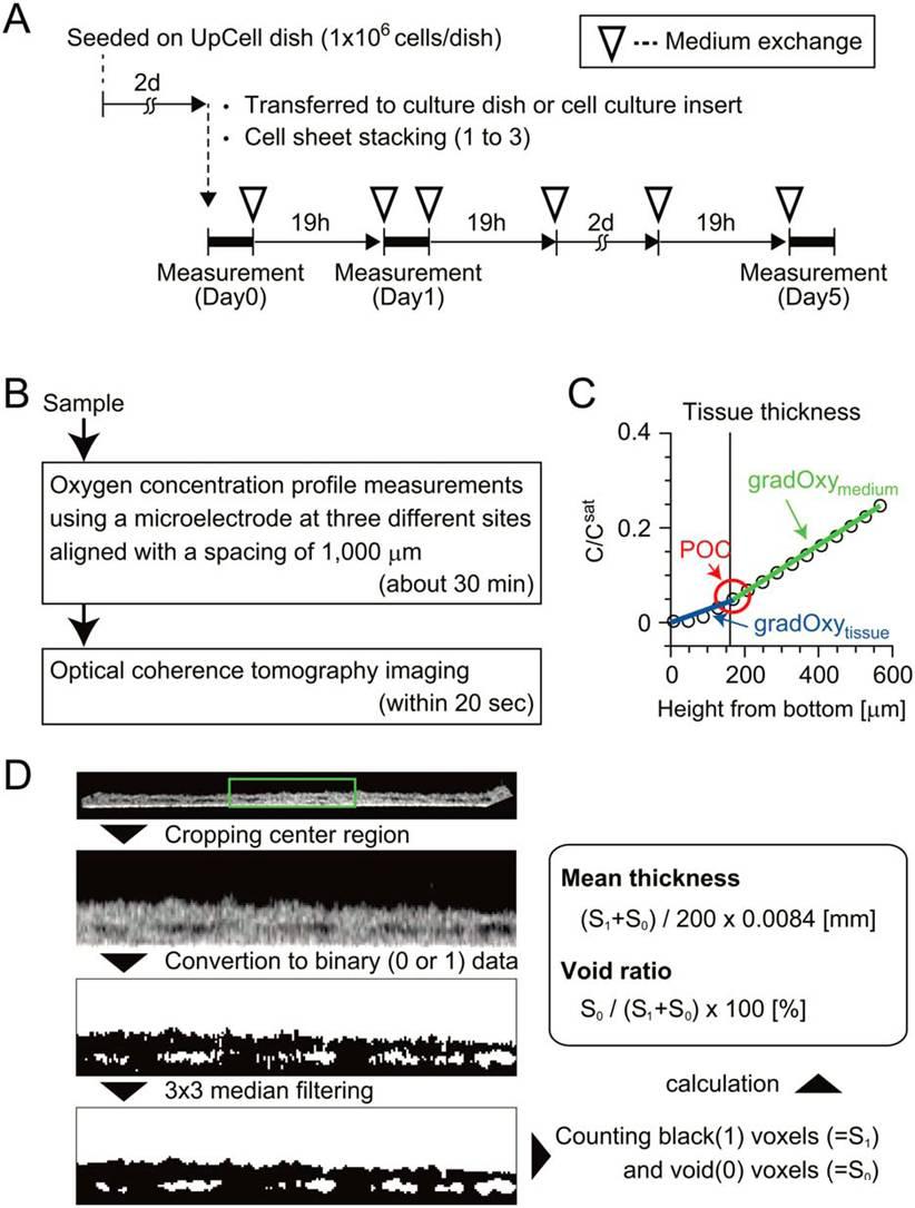 圖1、研究流程示意圖。圖(A)表示的是單個測試實驗的時間安排表。圖(B)表示的是應用氧微電極測試培養的層狀細胞氧濃度剖面的測試方法。(C)測試一定厚度的含層狀細胞的氧剖面濃度確定的定三種參數:POC(樣品中細胞周圍的氧濃度)、gradOxmedium(樣品中培養基中的氧梯度)gradOxytissuess(樣品中細胞組織的氧梯度)。圖(D)表示的是光學相干斷層掃描(OCT)系統獲得的橫斷層面截流動影像圖。