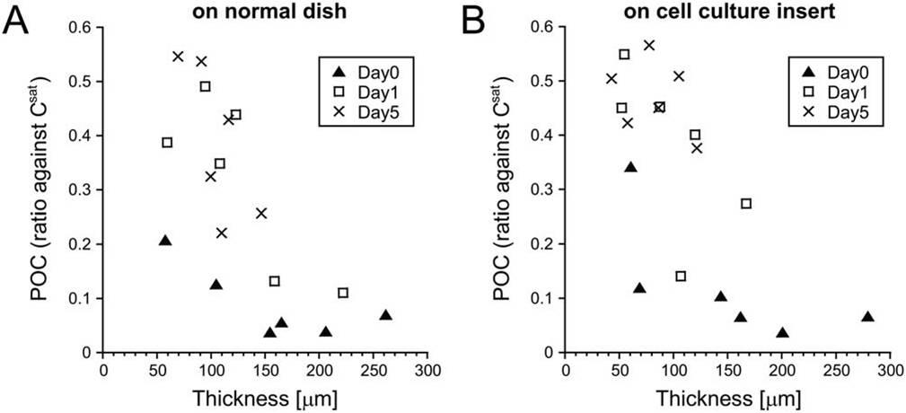 圖3、在0-5天的培養過程中測量的細胞組織樣品厚度、細胞培養時間、細胞周圍氧濃度(POCs)之間的相關性實驗。其中圖(A)在正常培養皿上進行細胞培養;圖(B)在細胞培養池進行培養。其中圖中的第0天、第1天和第5天獲得的數據分別采用三角形、正方形及×形表示以便區分。