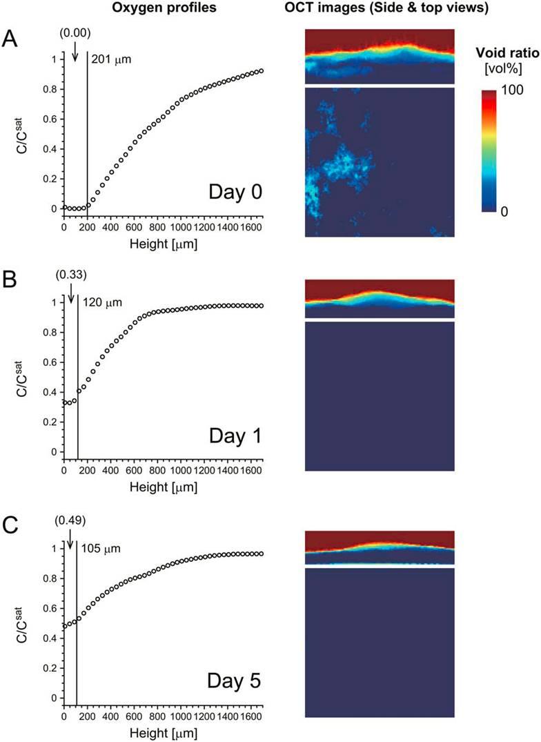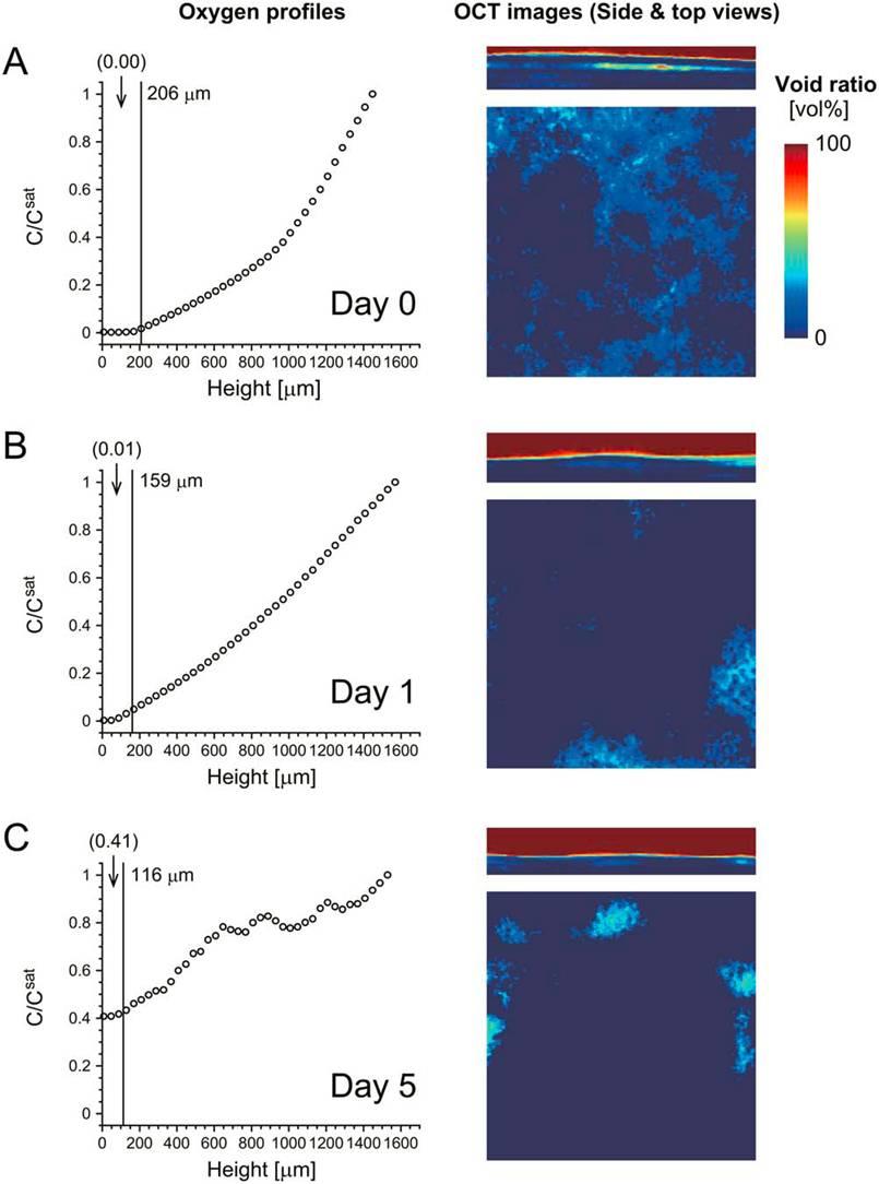 圖2、在正常培養皿中培養的細胞組織樣本在一次實驗中獲得的一個示例實驗數據集。并給出了在第0天(圖A所示),第1天(圖B所示)和第5天(圖C所示)培養周期的三層的成肌細胞樣本測試數據。左邊的圖表示的是氧的剖面濃度分布。其中圖中顯示的氧氣濃度值的是與培養基與空氣界面處的氧濃度(Csat)的比值。一條垂直線表示的是層狀細胞和培養基之間的邊界。樣品組織的平均厚度就是顯示在這條線附近區域。圓括號中的數值表示層狀細胞內的氧濃度與培養基與空氣界面處的氧濃度(Csat)的比值。右邊的圖顯示的是重組的組織樣本中心區域的3d圖像的側面和頂部視圖,應用的是OCT系統獲得的橫斷層面影像圖。其中不同的空隙率值采用了不同的顏色表現出來。