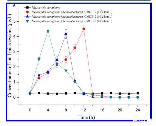 在去除有毒有害藻華的措施過程中通常會引起藻類細胞的溶解和微囊藻的釋放。本論文分離出了一種具有明顯的海藻溶解活性和MCs降解能力的不動桿菌,研究了這類產毒微囊藻的生理反應及形態學特征。通過測試藍藻/藍藻菌共培養系統中研究了藍藻細胞內和細胞外的MC-LR(微囊藻毒素)濃度。不動桿菌屬-CMDB-2能夠導致藻類細胞的徹底分解及藻細胞因24小時光合作用引起的損傷。提高藻細胞溶解和MC-LR釋放,隨著體系中的細菌密度增加(1×103~1×107個),在不考慮細菌密度情況下的14小時內,體系內的微囊藻毒素被降低近94%。通過對細胞外和細胞內微囊藻毒素的測量顯示,相對于對比組和細菌無細胞濾液系統,細菌細胞孵育系統中的毒素降低了92%。實驗結果證實,細菌代謝物對微囊藻的裂解率為92%,而細菌細胞負責約91%的微囊藻毒素的減少。