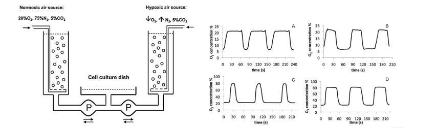 用丹麥Unisense O2微電極測量了人肺泡上皮細胞(A549)和小鼠黑色素瘤細胞(b16-f10)在快速變化的缺氧模式下的氧濃度,連續測量8小時。圖A和圖B為兩種氧模式,周期都為90秒,只是缺氧階段持續的時間不同。圖C和圖D為兩種間歇性高氧模式。(A bioreactor for subjecting cultured cells to fast-rate intermittent hypoxia)