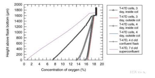 結果表明,如果不測細胞周圍的O2濃度,則不可能正確關聯到體外培養結果(例如基因表達與細胞耗氧量),因為這和氣相記錄的O2濃度完全不同。因此監測細胞細胞周圍O2濃度和細胞的O2消耗十分重要。數據顯示,細胞融合時O2消耗劇增。(Pericellular oxygen depletion during ordinary tissue culturing,measured with oxygen microsensors)